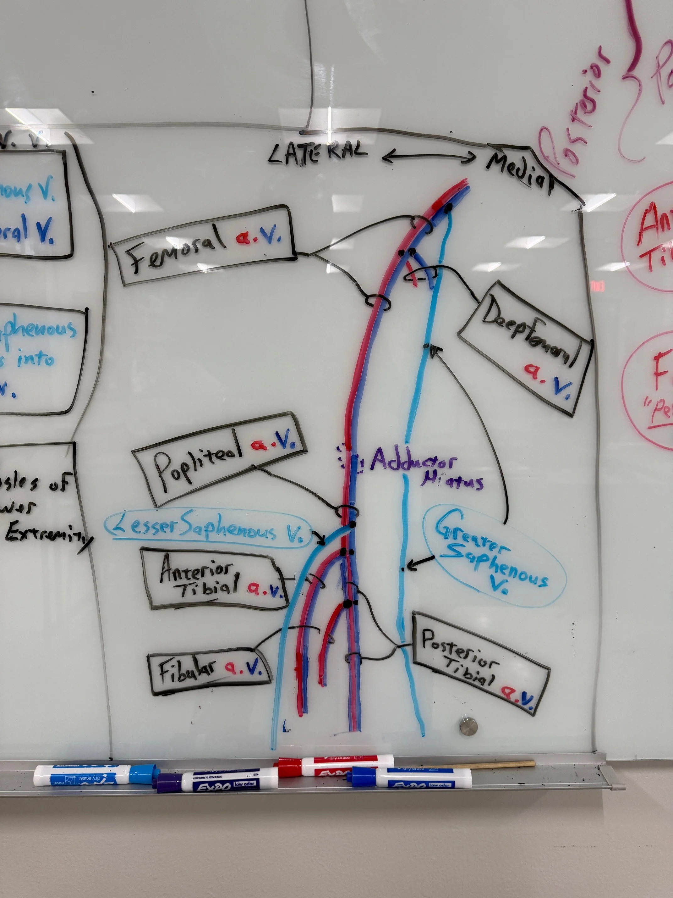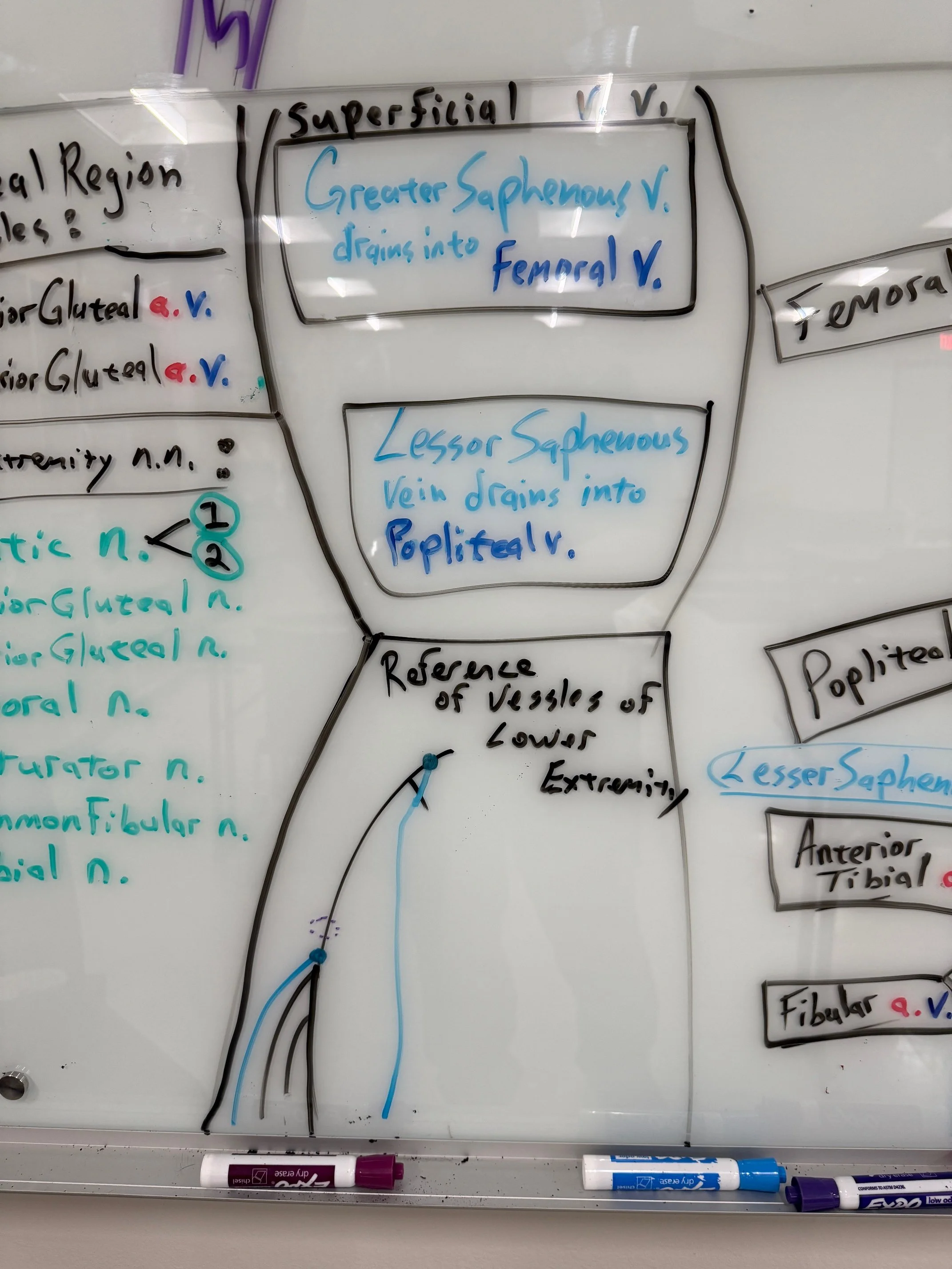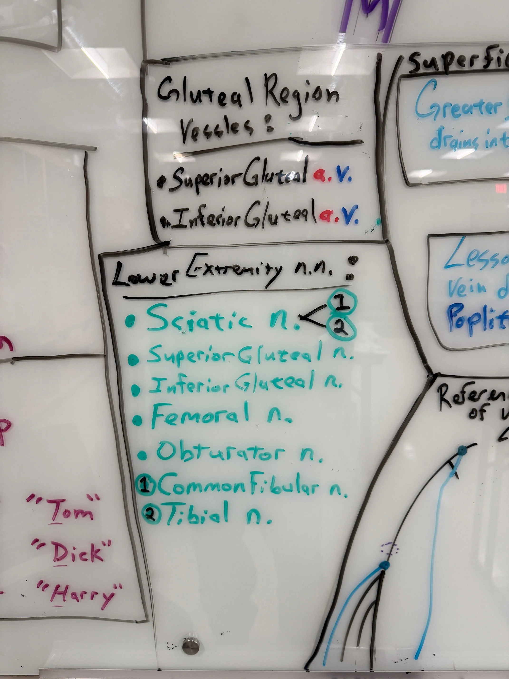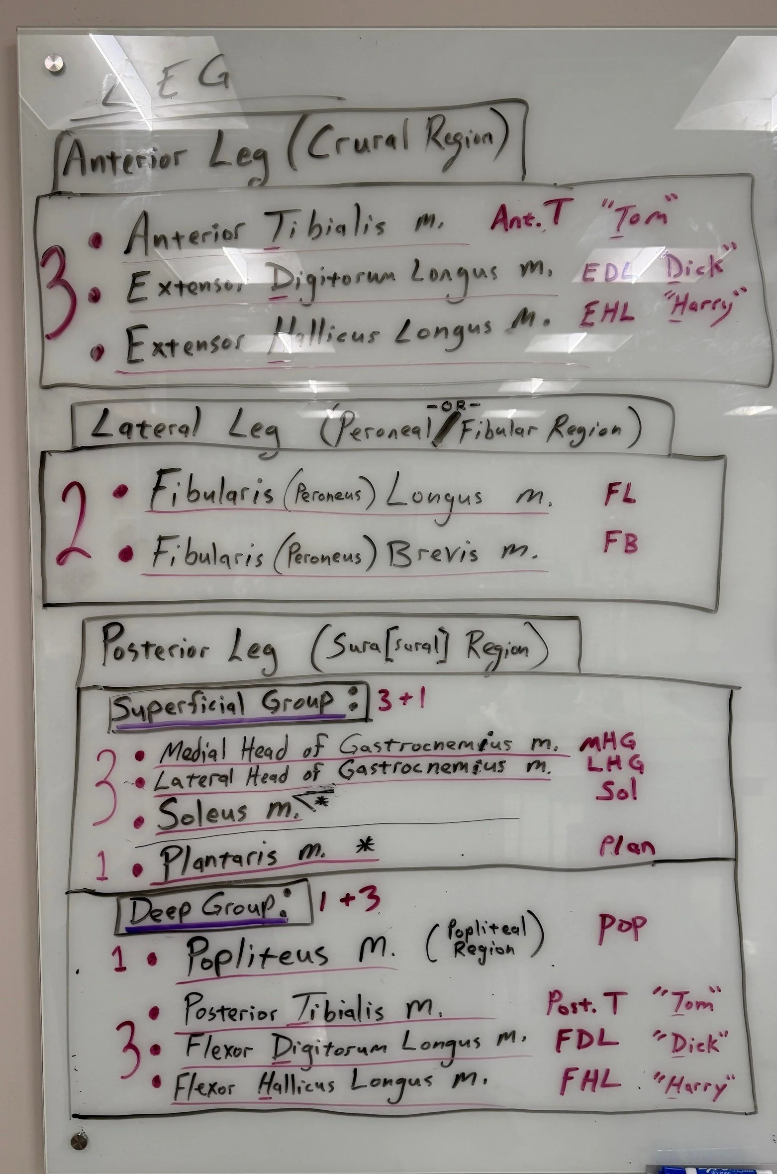 A systematic way to organize the muscles of the lower extremity. Also included are the drawings of the nerves, arteries, and veins of the lower extremity.